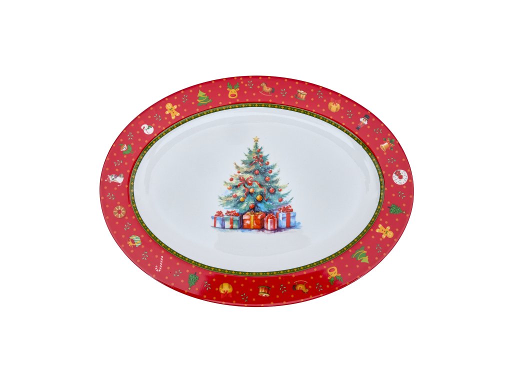 Oválny vianočný podnos – Červený. Elegantný vianočný podnos z prémiového porcelánu. Tento červený podnos, alebo vianočná tácka, je praktický a vhodný do umývačky riadu aj mikrovlnky.