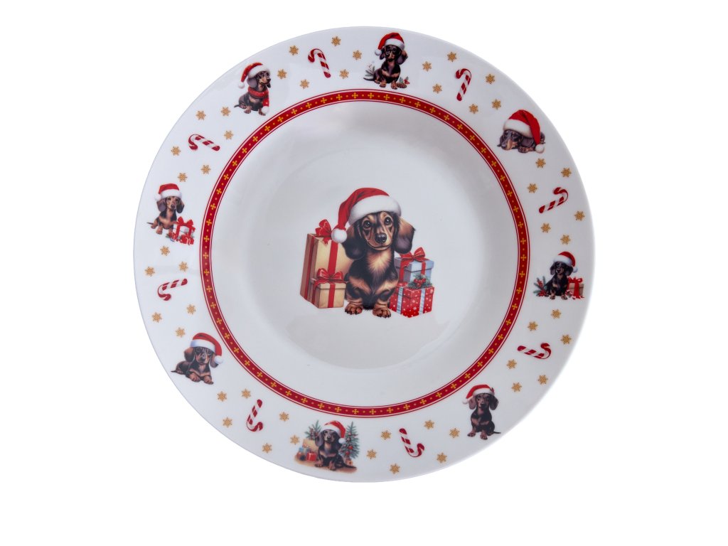 Vianočný hlboký tanier – Jazvečík. Elegantný vianočný hlboký tanier z prémiového porcelánu s priemerom 23 cm. Tento jazvečíkovský hlboký tanier je vhodný do umývačky riadu aj mikrovlnky.