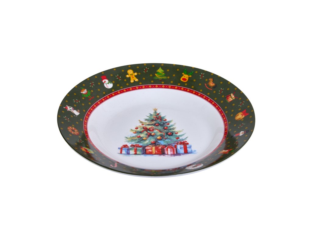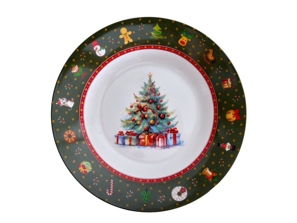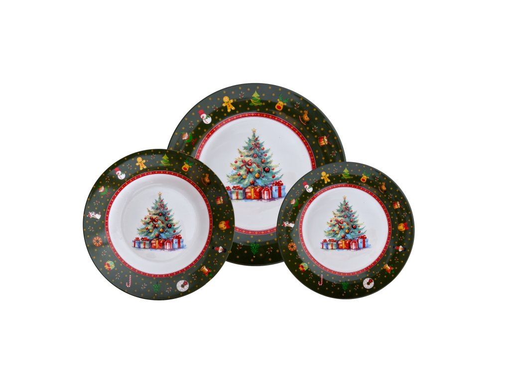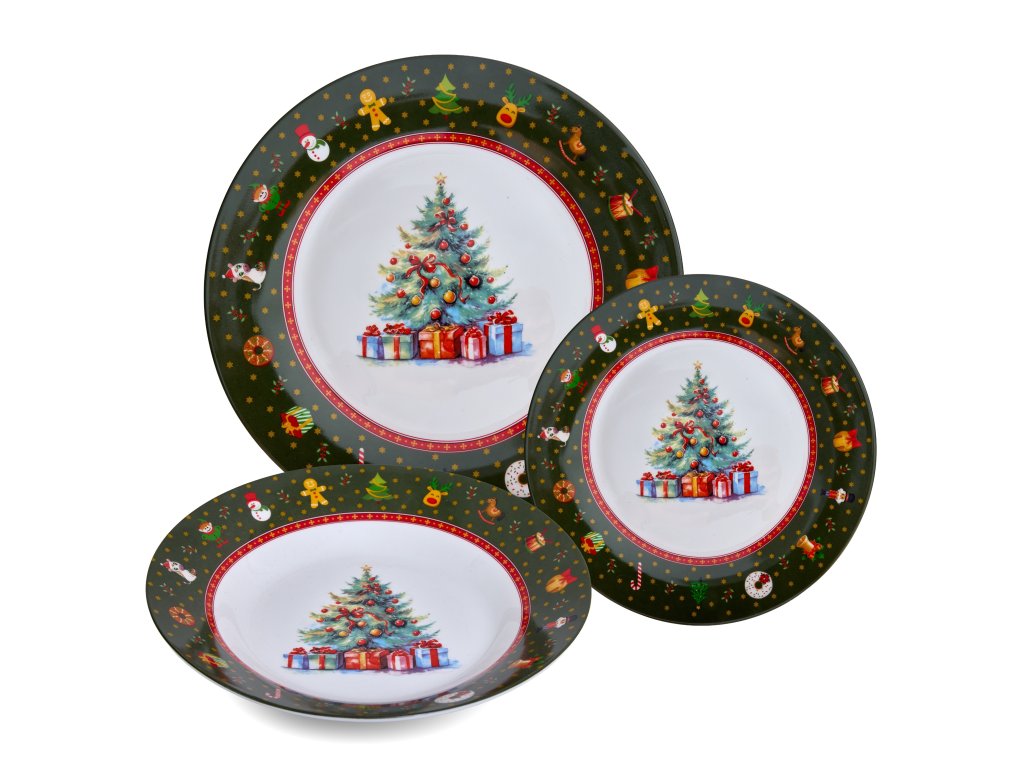 Zelená jedálenská sada tanierov s vianočným motívom obsahuje 18 dielov: 6 plytkých tanierov (27 cm), 6 hlbokých tanierov (22,5 cm) a 6 dezertných tanierov (20,3 cm). Vyrobená z prémiového porcelánu, vhodná do umývačky aj mikrovlnky.